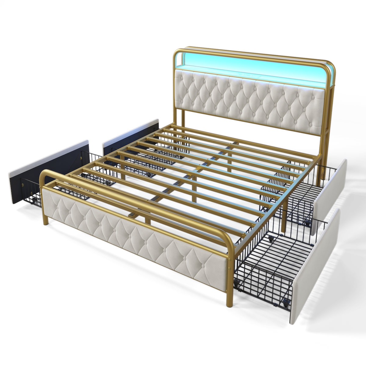 Merax Polsterbett Doppelbett mit aufladen USB Type C Ladefunktion APP-Control LED Metallbett 140×200 Bettrahmen und 4 Schubladen, Samt, Weiß