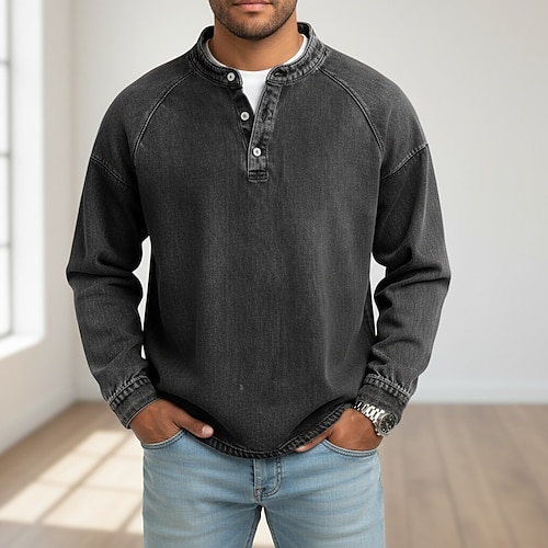 Per uomo Maglietta Maglia Henley Camicia di Jeans Camicia 100% cotone lavaggio acido Manica Lunga Semplice Vintage Streetwear Casual Lavato Manica corta Collo alla coreana Henley Casuale Streetwear