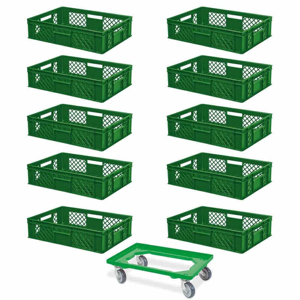 BRB 10 Euroboxen, 600x400x150 mm, lebensmittelecht, grün + Transportroller