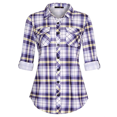 Per donna Camicia Blusa Plaid Semplice Elegante Vintage Signore Manica Lunga Colletto a Camicia Top Regolari Quotidiano Lavoro Ferie Arricciato Patchwork Tasca Blu Nero Giallo Rosso Viola chiaro
