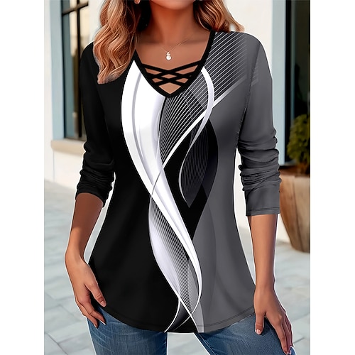 Per donna Maglietta Grafico Geometrico Geometria Vintage Elegante Classico Manica Lunga Scollo a V Top Regolari Quotidiano Taglio Stampato Bianco e nero Autunno Inverno