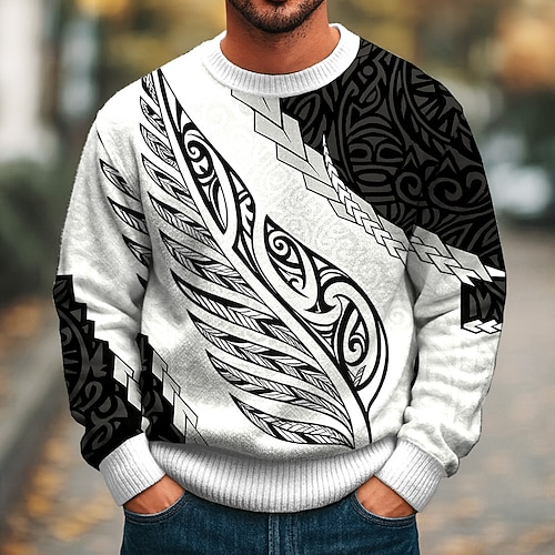 Per uomo Foglia Maglione Maglieria Girocollo Casual Vacanza Streetwear Quotidiano Stampa 3D Lavoro a maglia Tenere al caldo Manica Lunga Primavera Autunno Inverno Nero Bianco