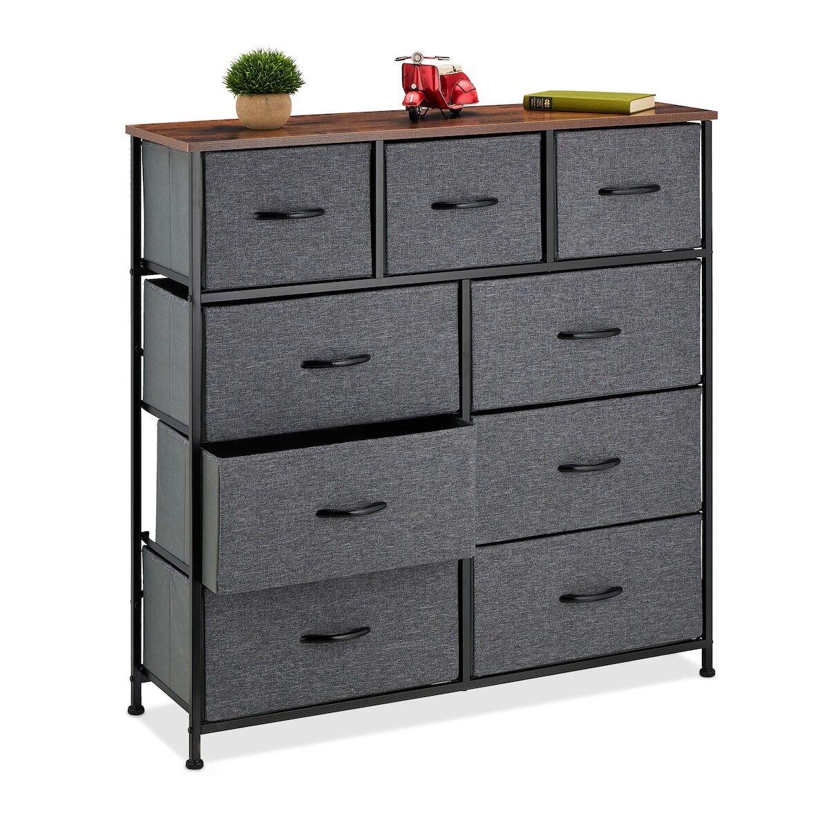 Relaxdays Kommode, HBT 100x100x30 cm, Metall, Holzoptik, 9 Stoff-Schubladen, Ablage, moderne Beistellkommode, mehrfarbig