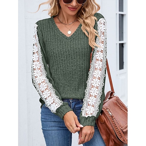 Per donna Blusa Tinta unica Elegante Essenziale Casual Manica Lunga Scollo a V Top Regolari Quotidiano Pizzo Patchwork Blu Nero Rosa Verde militare Fucsia Primavera Autunno Inverno