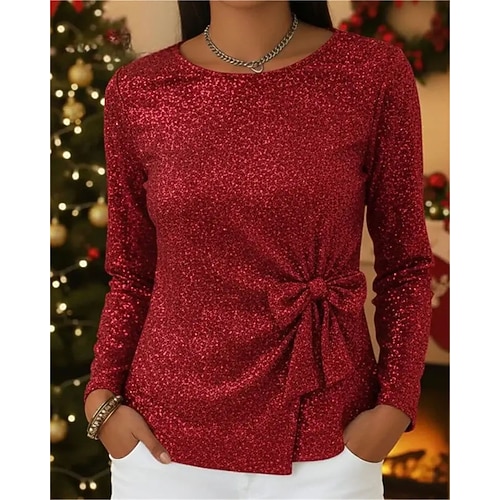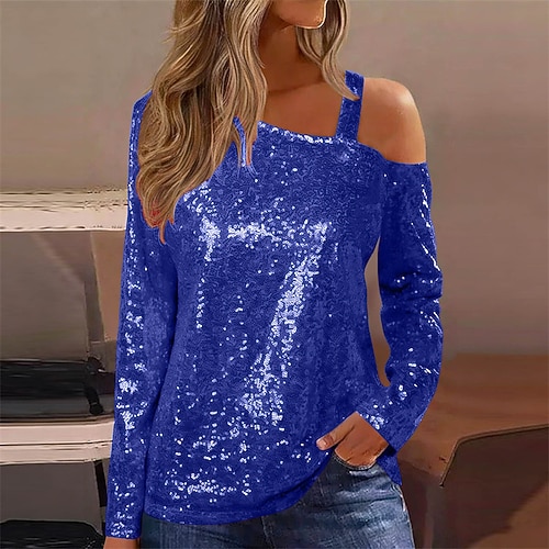 Natale Per donna Blusa Top Eleganti Top con paillettes Semplice Elegante Vintage Quotidiano Manica Lunga Girocollo Top Regolari Lavoro Quotidiano Ferie Arricciato Paillettes Patchwork Blu Argento