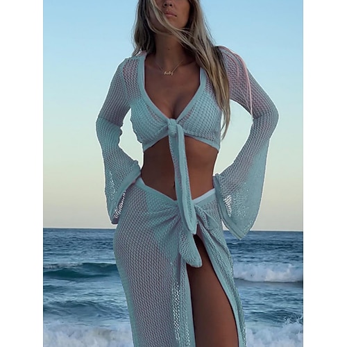 Costume da bagno coprente a due pezzi da donna Maglina Vacanza Mare Abbigliamento Colore Unito Collo a V Maniche Lunghe