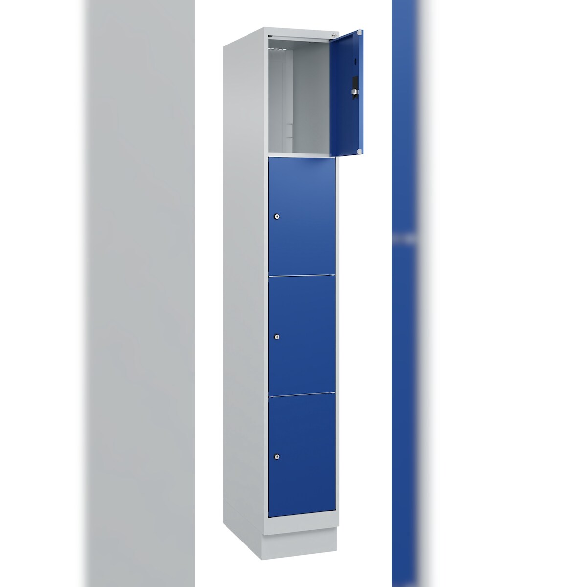 C+P Schließfachschränke Classic PLUS, Sockel, 4 Abteile, HxBxT 195x30x50cm, Zylinderschloss, Hellgrau/Enzianblau von PROREGAL