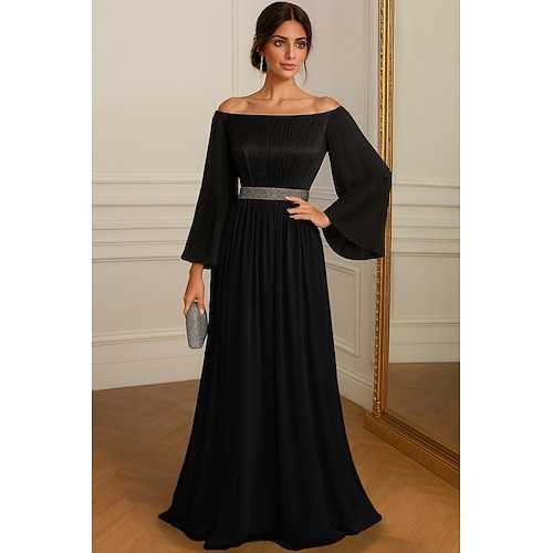 Linea ad A Lunghezza al pavimento Abito da Sera Elegante Manica Lunga Senza Spalle Matrimonio Formale Misto Cotone con Strass