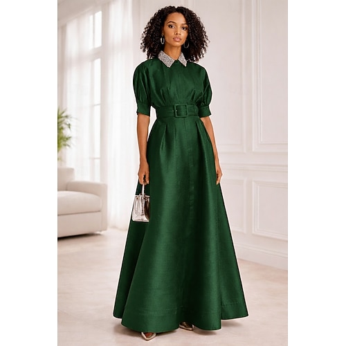 Linea ad A Lunghezza al pavimento Abito da Sera Elegante Manica 3/4 Colletto a Camicia Formale Raso con Applicazioni