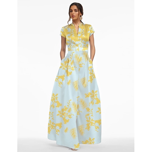 Linea ad A Lunghezza al pavimento Abito da Sera Abito formale Elegante Setoso Manica Corta Scollo a V Matrimonio Formale Raso con Stampa floreale