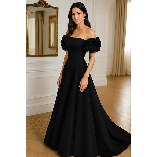 Linea ad A Lunghezza al pavimento Abito da Sera Da principessa Abito formale Elegante Vintage Setoso Manica Corta Senza Spalle Matrimonio Formale Tasca Raso con Tasca