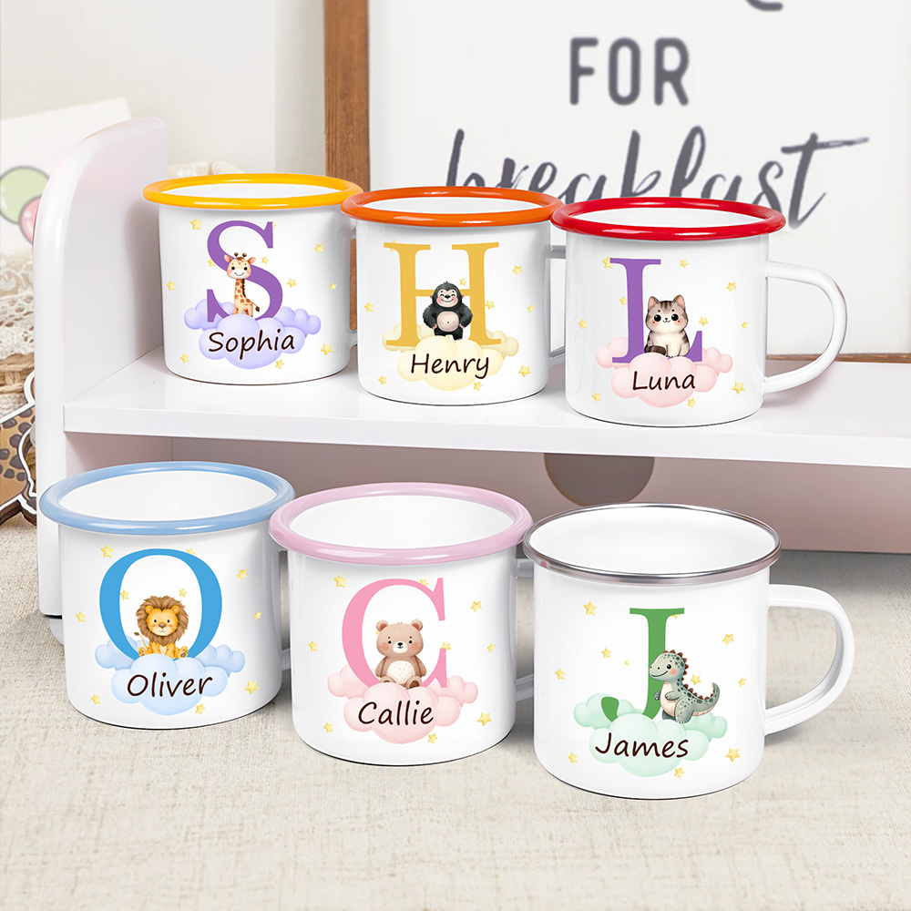 Tazza smaltata con bordo colorato da 12 oz con iniziali e nome, regalo di compleanno per bambini, personalizzata con un orso carino, un dinosauro e un animale della foresta.