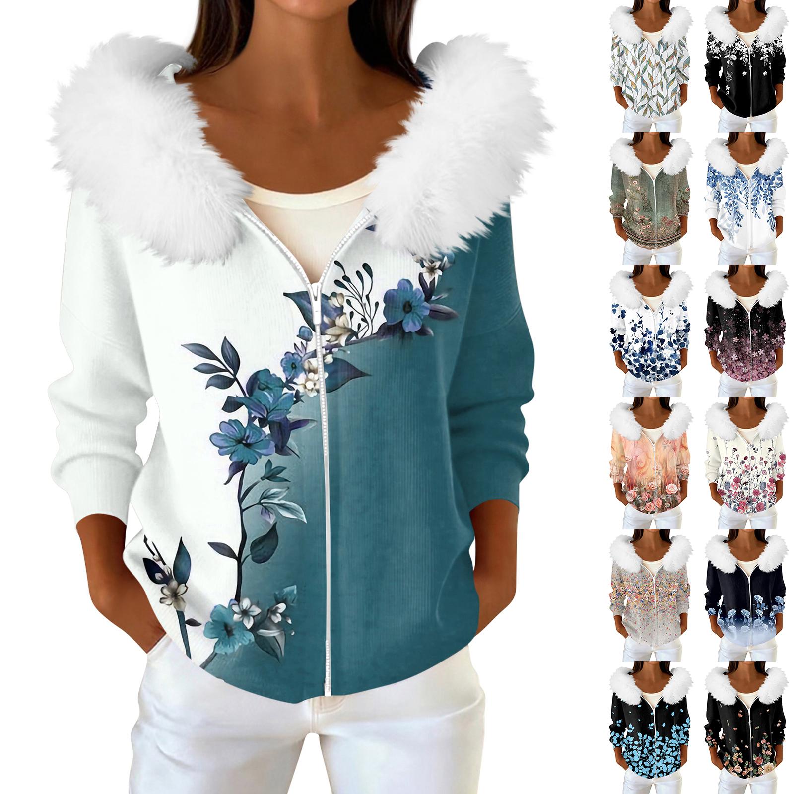 Women's Fashion Casual Sweater Zipper Print Cardigan Plush Hooded Jacket cm light gray
