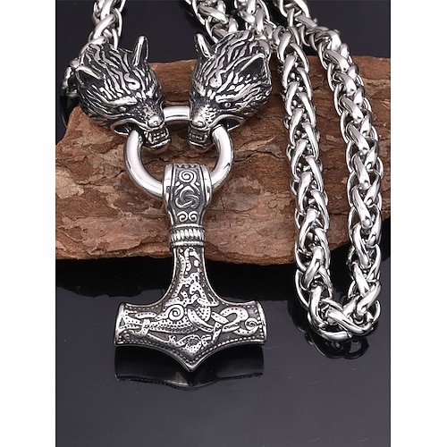 Collana con ciondolo in stile vichingo da uomo, materiale in lega con testa di lupo e design a martello di Thor, gioielli nordici unici per abbigliamento casual e da festa