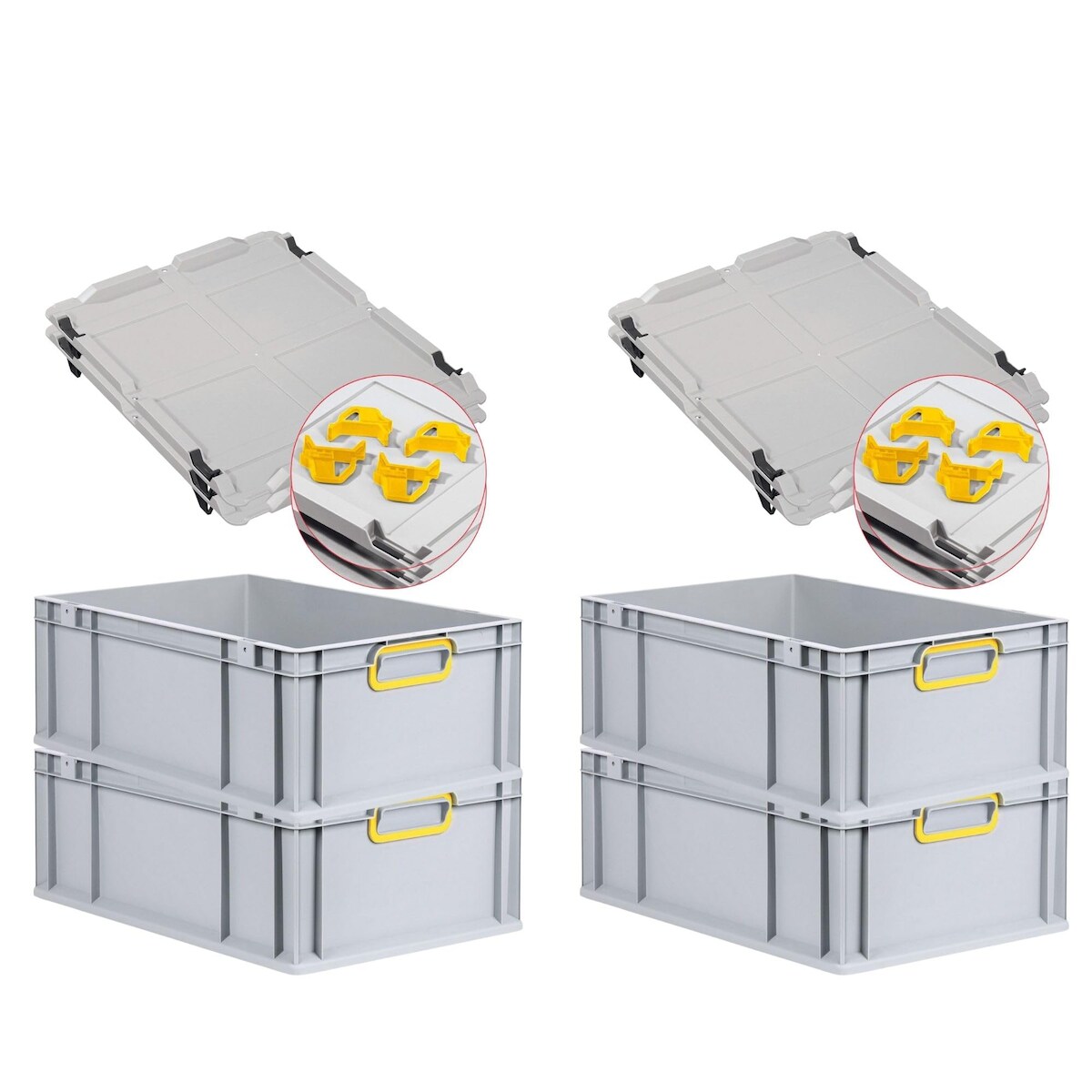 PROREGAL SuperSparSet 4x Eurobox NextGen Color mit Auflagedeckel & Verschlüsse, HxBxT 22x40x60cm, 44L, Grau, Griffe gelb zu, Eurobehälter, Box