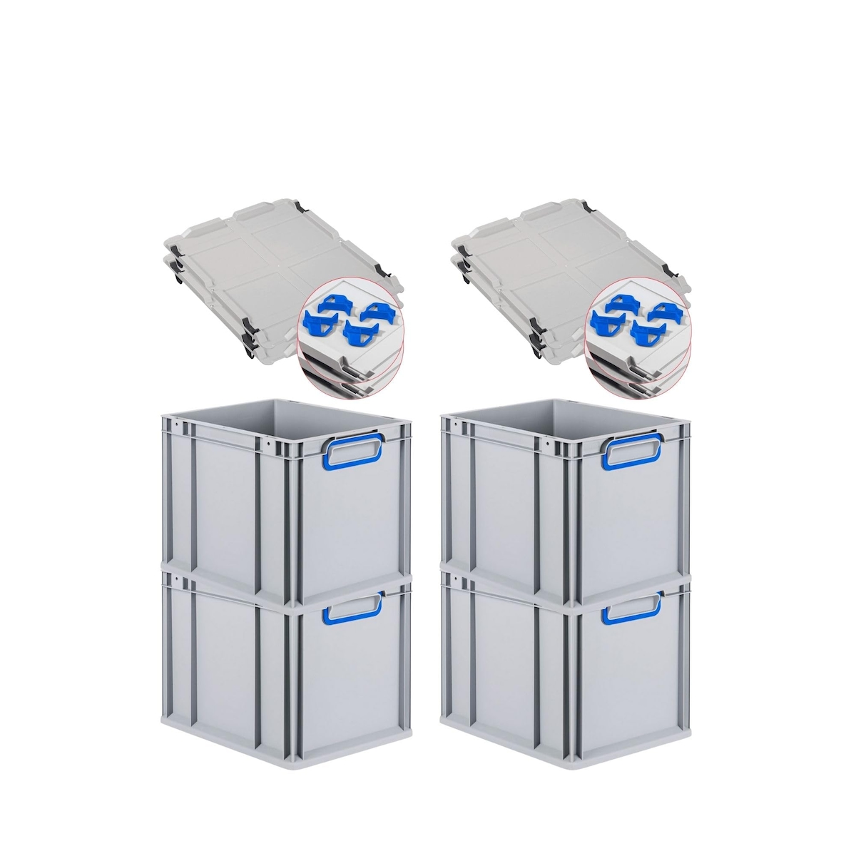 PROREGAL SuperSparSet 4x Eurobox NextGen Color mit Auflagedeckel & Verschlüsse, HxBxT 32x30x40cm, 30L, Grau, Griffe blau zu, Eurobehälter, Box