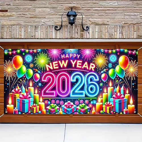 Capodanno arazzo Copertura per porta del garage Grande appeso Buon anno 2026 Fuochi d'artificio Carino 3D Da serata All'aperto Vacanze Sfondi di ripresa Yarda Arredamento per la casa