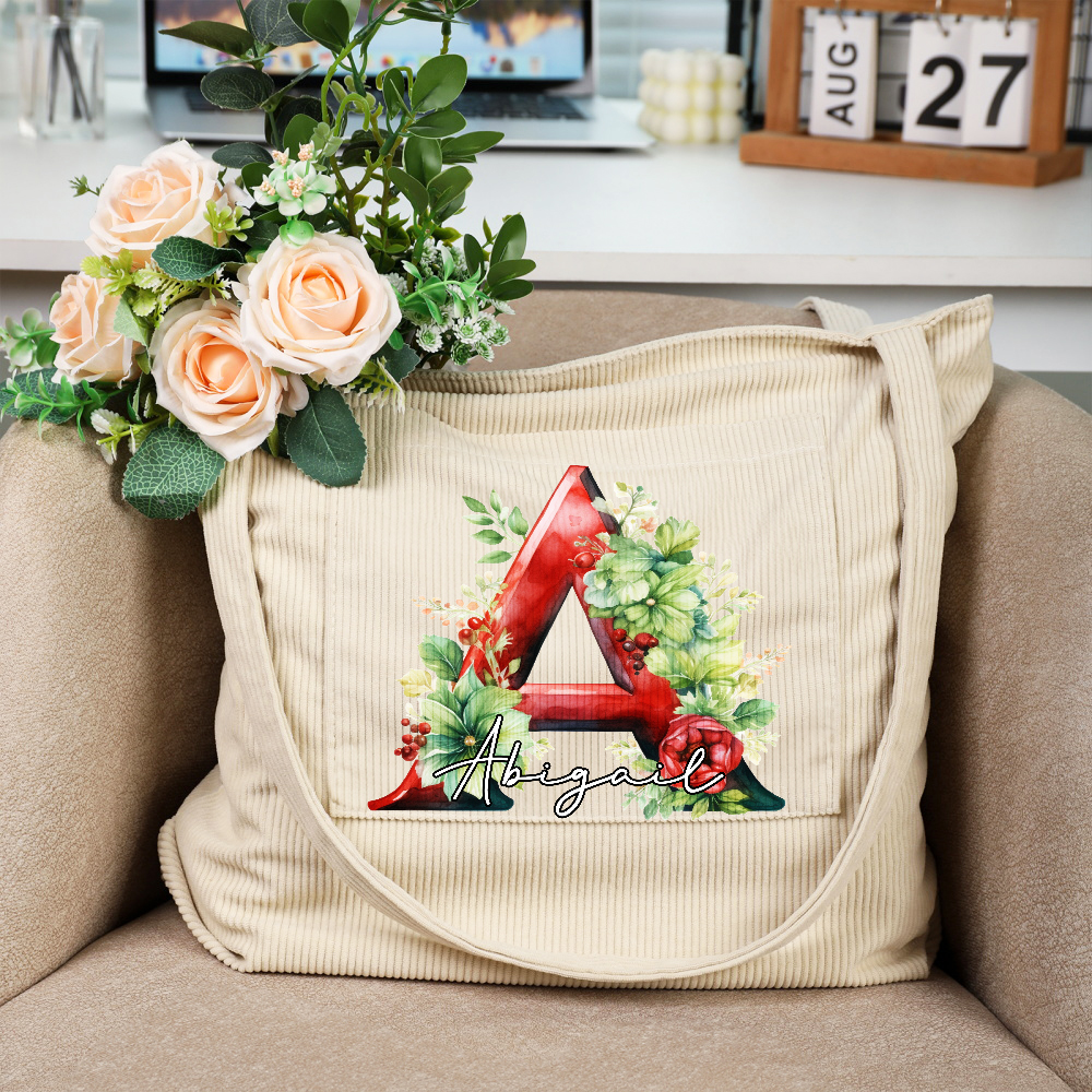 Personalisierte 3D Floral Initial großen Cord Tragetasche mit Namen und Griff Tote Bag für Casual Shopping Arbeit Weihnachtsgeschenk für Damen