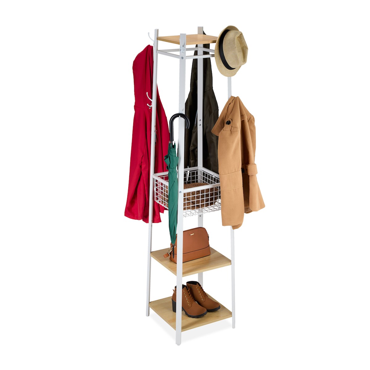 Relaxdays Garderobenständer, 3 Ablagen u. 8 Haken, HBT: 181x43x43 cm, Jackenständer mit Korb, Flur, Metall, weiß/natur
