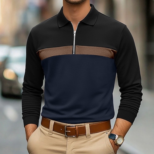 Per uomo POLO Polo con zip a un quarto Ufficio Da tutti i giorni Bavero Manica lunga Di tendenza Comodo Color Block Tasche Zip Up Primavera Autunno Standard Nero Marrone Verde militare Blu scuro