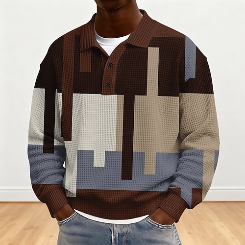 Per uomo Geometrico Linea Magliette Polo a Nido d'Ape Manica Lunga Magliette polo Camicie con Colletto Casual Abbigliamento quotidiano Bottoni Primavera Autunno Inverno Bianco Blu Grigio chiaro