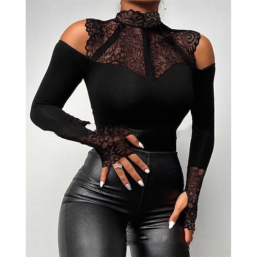 Per donna Top con cuciture in pizzo Top estivi Blusa Top Eleganti Semplice Elegante Vintage Signore Manica Lunga Collo Alto Top Regolari Quotidiano Lavoro Ferie Arricciato Pizzo Patchwork Nero