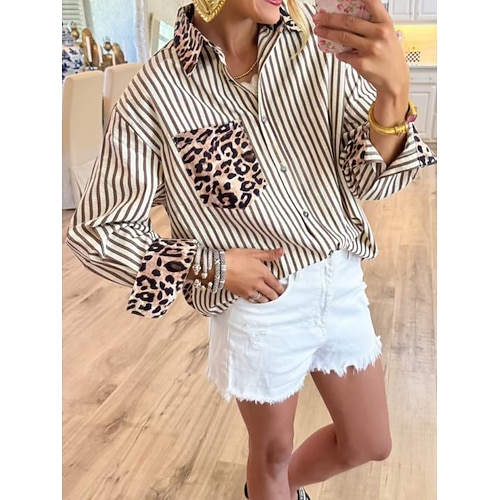 Per donna Blusa Leopardo A righe Elegante Casual Manica Lunga Colletto a Camicia Top Regolari Quotidiano Bottoni Stampato Azzurro cielo Cachi Estate Primavera Autunno