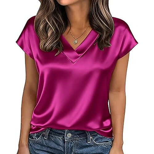 Per donna Camicia in raso Blusa Semplice Elegante Vintage Manica Corta Scollo a V Top Regolari Quotidiano Ferie Uscire Patchwork Nero Bianco Champagne Vino Rosso Estate Primavera Autunno