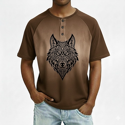 Per uomo Lupo Vichingo Maglia Henley Manica Corta Moda Designer Retrò Vintage Quotidiano All'aperto Primavera Autunno Tutte le stagioni Marrone Blu scuro Verde scuro Henley Maglietta Henley