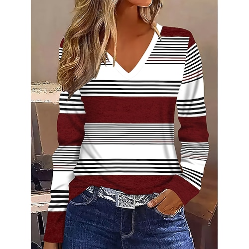 Per donna Maglietta Grafico Geometrico A righe Vintage Elegante Classico Manica Lunga Scollo a V Top Regolari Quotidiano Stampato Blu Marrone rossastro Marrone Primavera Autunno Inverno