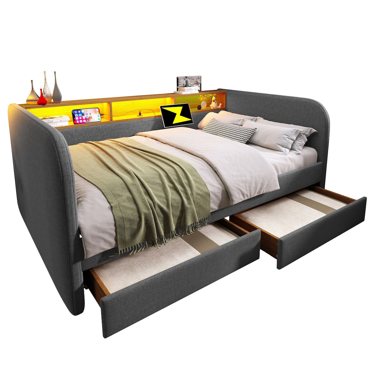 OKWISH Polsterbett LED Beleuchtung USB Type-C Ladefunktion Doppel-Schubladen Stauraum Modernes Design Holzmaserung 140x190 cm Grau