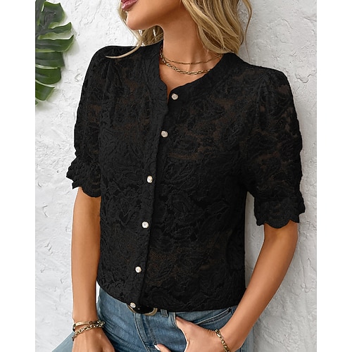 Per donna Blusa Top in pizzo Semplice Vintage Elegante Manica Corta Girocollo Top Regolari Quotidiano Ferie Uscire Pizzo Bottoni Nero Bianco Albicocca Estate