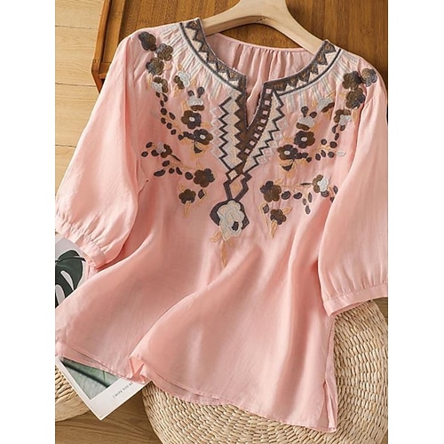 Per donna Blusa Floreale Elegante Casual Manica 3/4 Girocollo Top Regolari Quotidiano Arricciato Ricamato Blu Bianco Rosa Viola Verde Estate Primavera