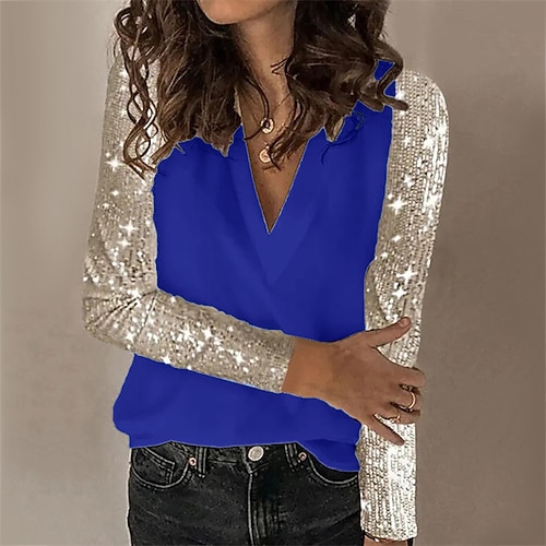 Per donna Blusa Top Eleganti Top con paillettes Semplice Elegante Vintage Signore Manica Lunga Scollo a V Top Regolari Quotidiano Lavoro Ferie Arricciato Paillettes Patchwork Blu Nero Blu marino