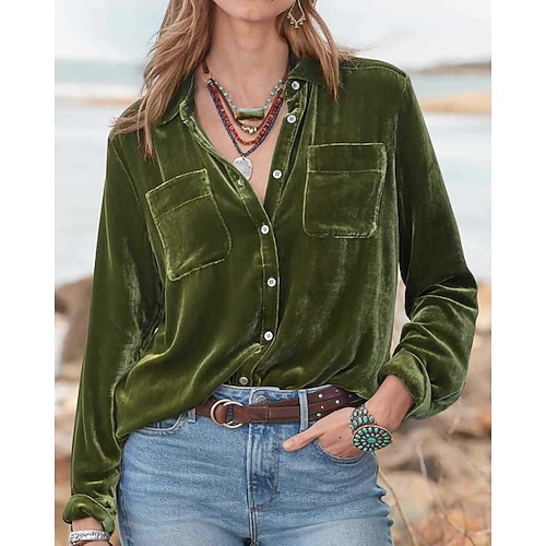 Per donna Camicia Velluto Blusa Semplice Elegante Manica Lunga Colletto a Camicia Top Regolari Ferie Uscire Bottoni Blu Vino Verde militare Primavera Autunno
