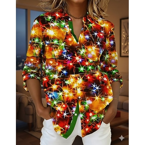 Capodanno Per donna Camicia Blusa Vintage Elegante Casual Manica Lunga Colletto a Camicia Top Regolari Quotidiano Patchwork Bottoni Stampato Arcobaleno Primavera Autunno Inverno