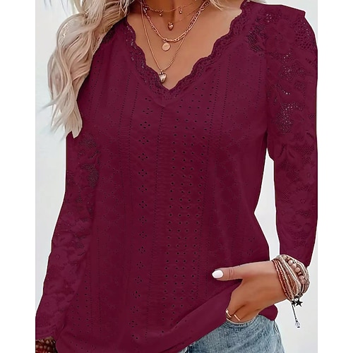 Per donna Blusa Top in pizzo Semplice Attivo Elegante Manica Lunga Scollo a V Top Regolari Quotidiano Ferie Uscire Pizzo Patchwork Bianco Rosa Vino Azzurro Estate Primavera