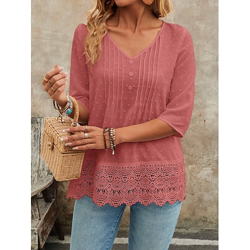 Per donna Blusa Tinta unica Elegante Casual Manica 3/4 Scollo a V Top Regolari Quotidiano Pizzo Patchwork Bottoni Blu Nero Bianco Rosa Primavera Autunno