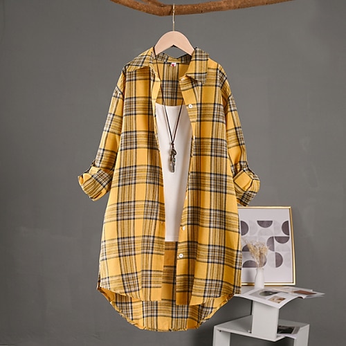 Per donna Camicia Camicie di cotone e lino Blusa Plaid Elegante Vintage Manica Lunga Colletto a Camicia Top lunghi Quotidiano Ferie Uscire Bottoni Giallo Rosso Verde Estate Primavera Autunno