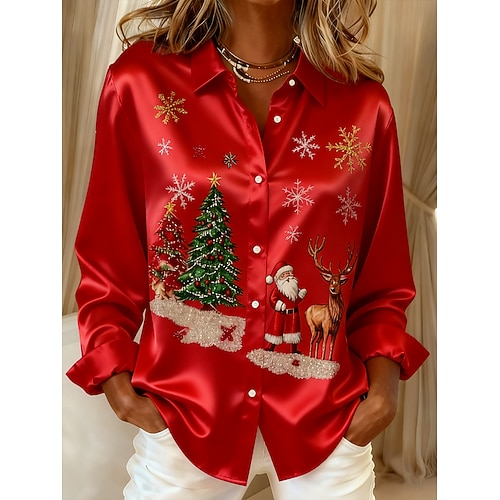 Natale Per donna Camicia Grafico Albero di Natale Vintage Elegante Moderno Manica Lunga Colletto a Camicia Top Regolari Quotidiano Ferie Rosso Beige Autunno Inverno