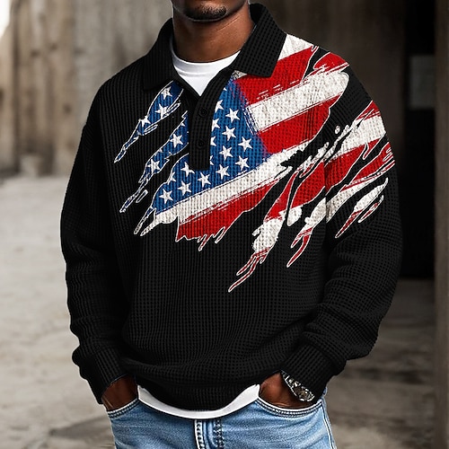 Giorno dell'Indipendenza Americana Per uomo Bandiera Americana Polo Testurizzato Manica Lunga Magliette polo Bavero Casual Athleisure Abbigliamento quotidiano Stampa 3D Primavera Autunno Inverno Blu