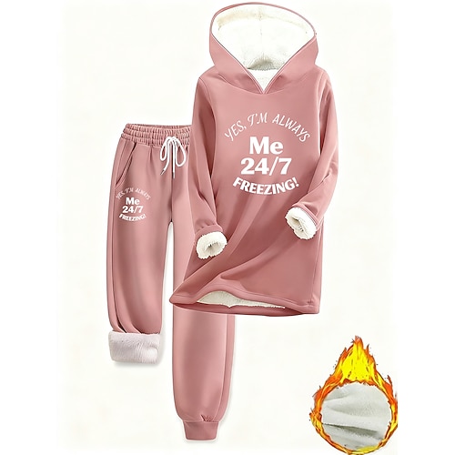 Set di pigiami da donna foderato in pile 2 pezzi felpa tuta completi top e pantaloni lettere caldo confort morbido home quotidiano letto caldo traspirante collo rotondo maniche lunghe felpa pantaloni