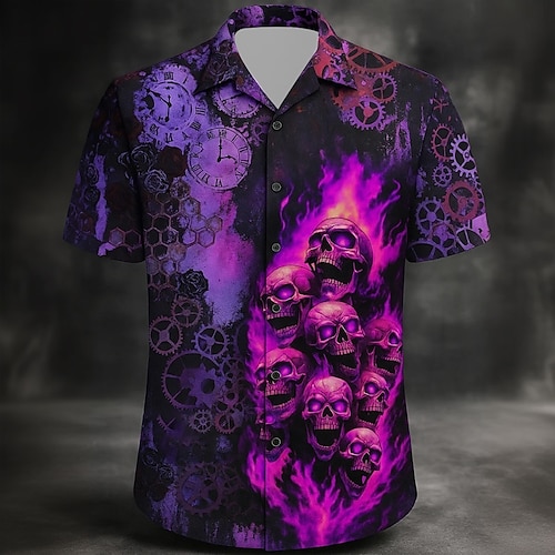 costumi da uomo teschio fiamma camicia colletto cubano camicia a bottoni maniche corte stile gotico scuro vacanza estate campo camicia colletto 3D stampa viola
