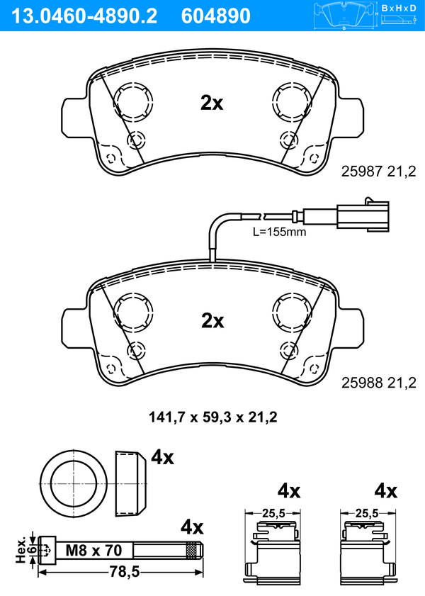 ATE Bremsbelagsatz, Scheibenbremse 13.0460-4890.2 hinten rechts links mit Zubehör für PEUGEOT FIAT CITROËN VAUXHALL OPEL 77367094 1612434080