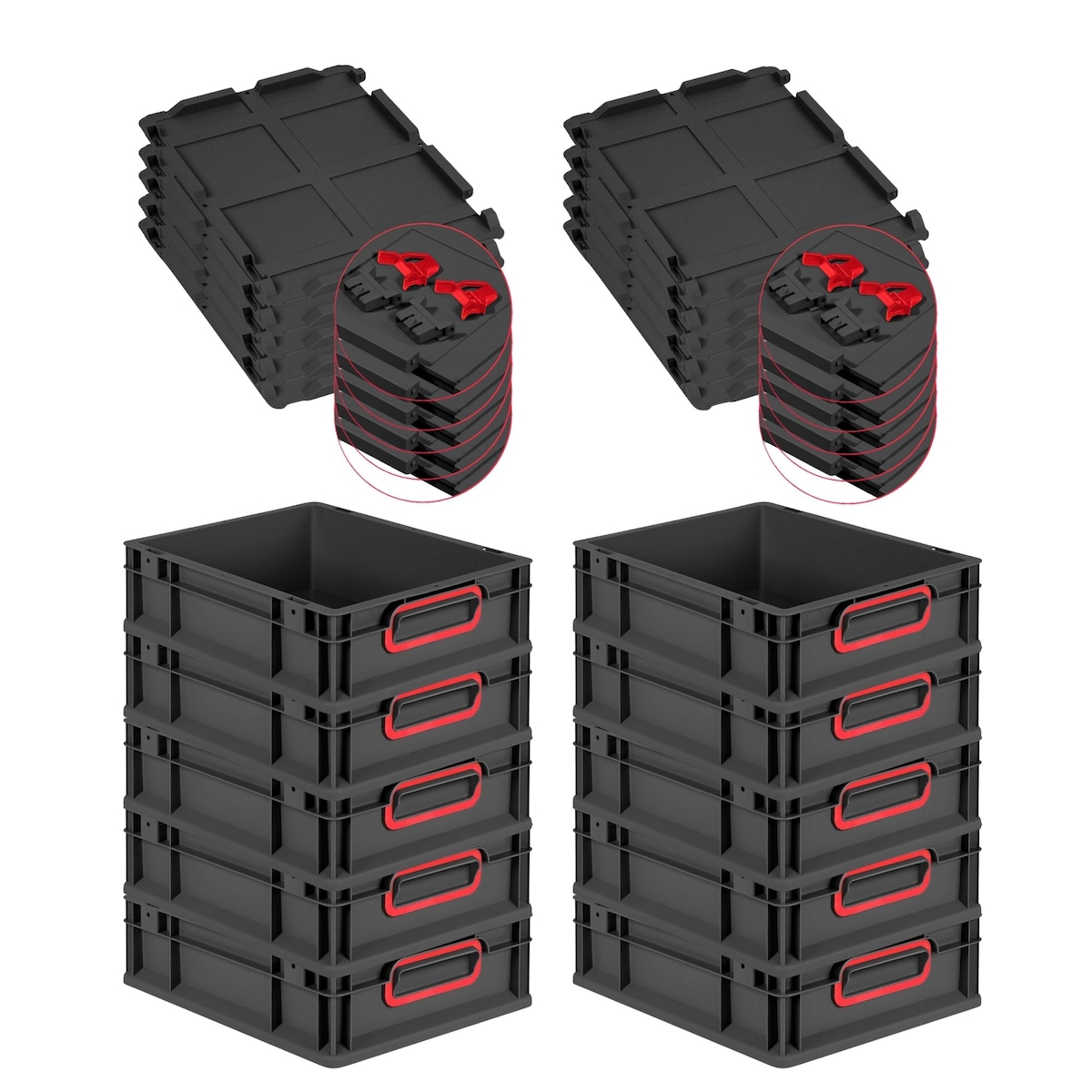PROREGAL SuperSparSet 10x Eurobox NextGen Color mit Scharnierdeckel & Verschlüssen, HxBxT 12x30x40cm, 11L, Schwarz, Griffe rot zu, Eurobehälter