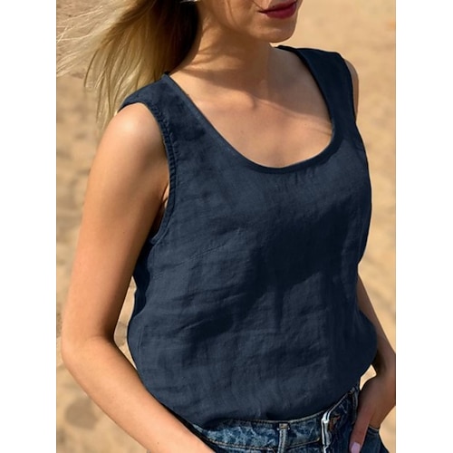 Per donna Gilet in cotone e lino Tinta unica Elegante Casual Senza Maniche Scollo Tondo Top Regolari Quotidiano Blu marino Verde Estate Primavera