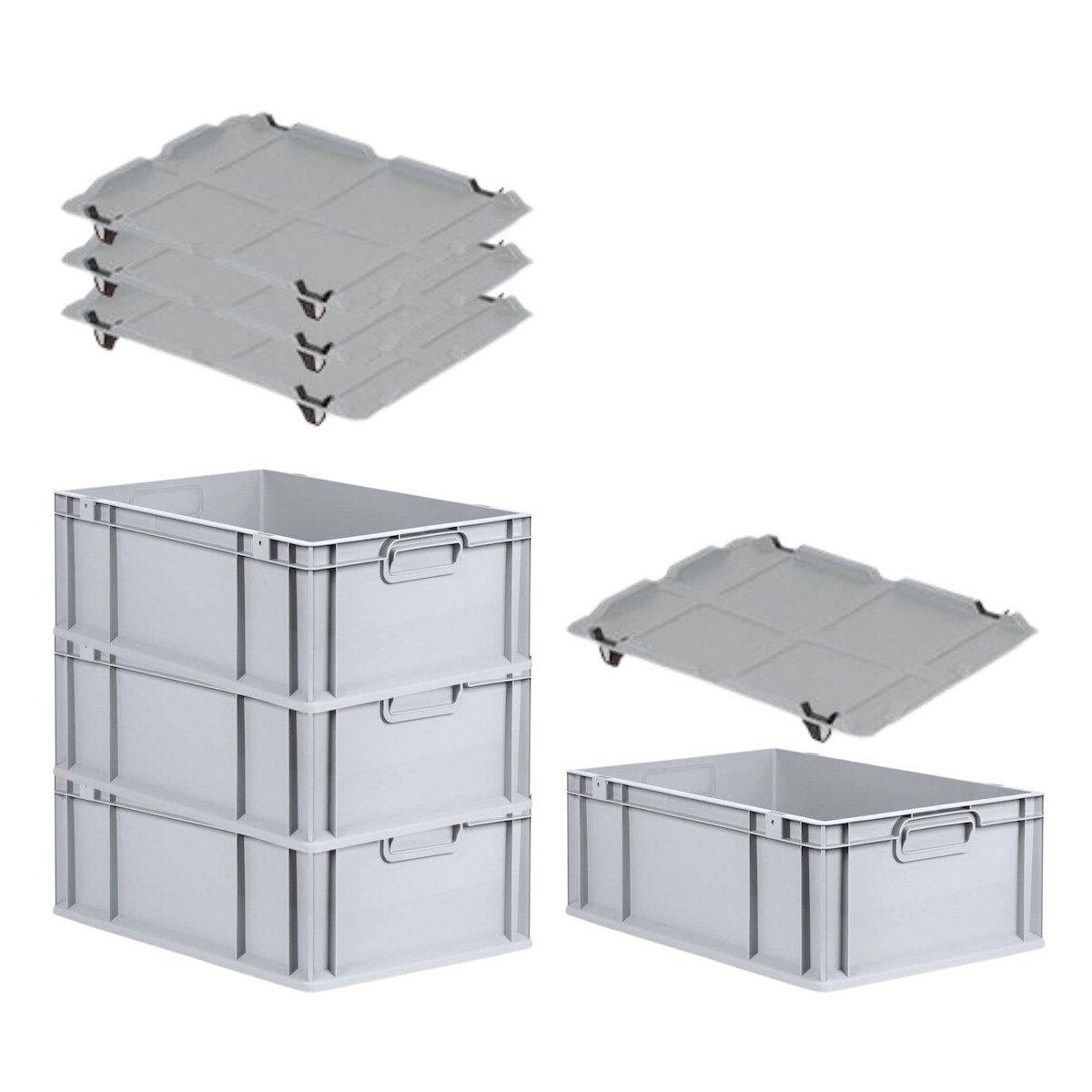 PROREGAL SuperSparSet 4x Eurobox NextGen Economy mit Auflagedeckel & 4x Verschlüsse Schwarz, Griffe zu, HxBxT 22x40x60cm, 44L, Eurobehälter, Box