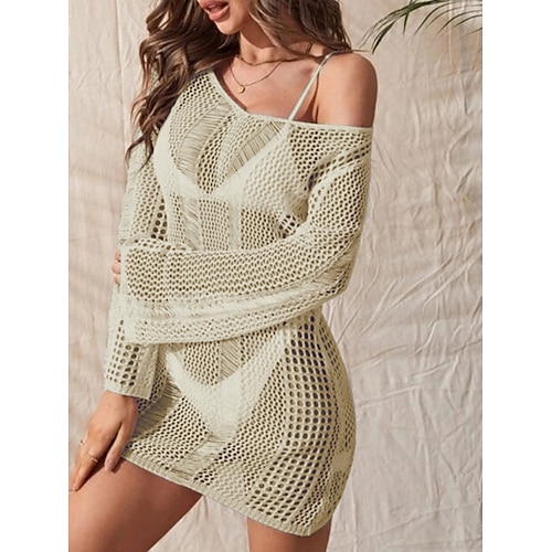 Copertura costume da bagno donna abito tagliato in maglia per le vacanze beach wear colore solido scollo a V maniche lunghe