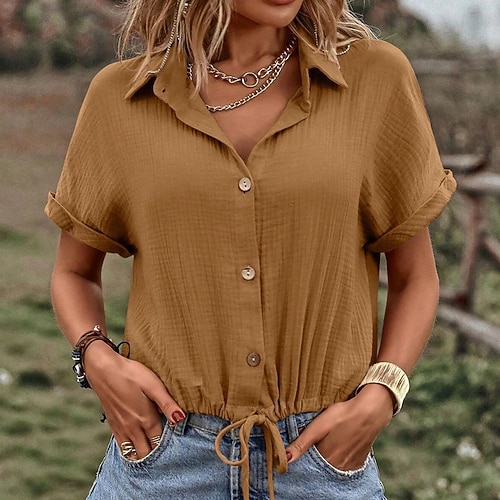 Camicia in lino sintetico da donna camicia casual camicia con bottoni arricciata coulisse bottoni colore solido semplice quotidiana elegante casual a maniche corte maniche a pipistrello scollo