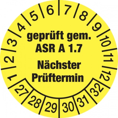 König Werbeanlagen Prüfplakette ab 27, ASR A1.7 Nächster Prüftermin, gelb/schwarz, Folie, Ø 30 mm - Bogen = 10 Plaketten - 30 mm Folie selbstklebend